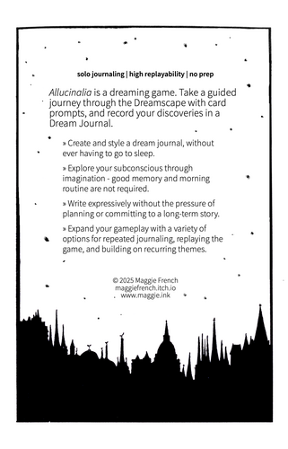 Allucinalia offers a way to explore your subconscious and enjoy the fun of a dream journal without requiring you to remember your own dreams. Prompts across a wide spectrum of tones and themes create an ever-shifting, strangely-connected, fantastical-but-familiar world. When you play repeatedly over time, you can explore themes in new and interesting ways, providing a launchpad for further creativity.