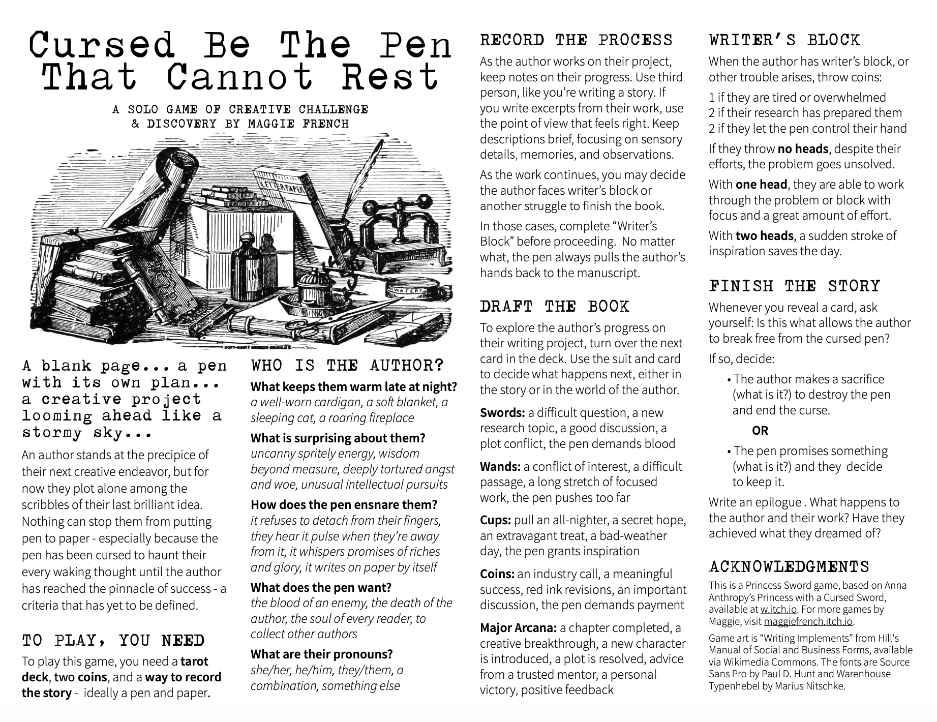| Tags | author, creativity, cursed, journaling, pen, princess-sword, Solo RPG, Tarot, Tabletop role-playing game, writer |