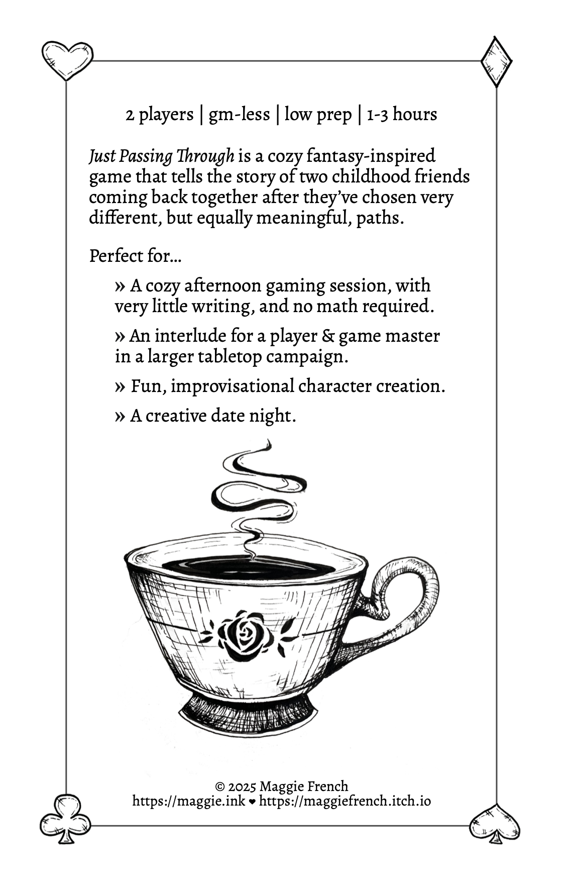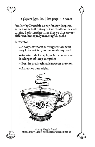 Just Passing Through is a cozy fantasy inspired, gm-less duet armchair role playing game. It tells the story of two childhood friends coming back together after one has gone off on grand magical quests, and one has stayed at home, living a life that may be more ordinary, but is no less beautiful as a result. As the Voyager passes through town, they stop to visit the Villager. While the old friends share a cup of tea, they pick up where they left off.