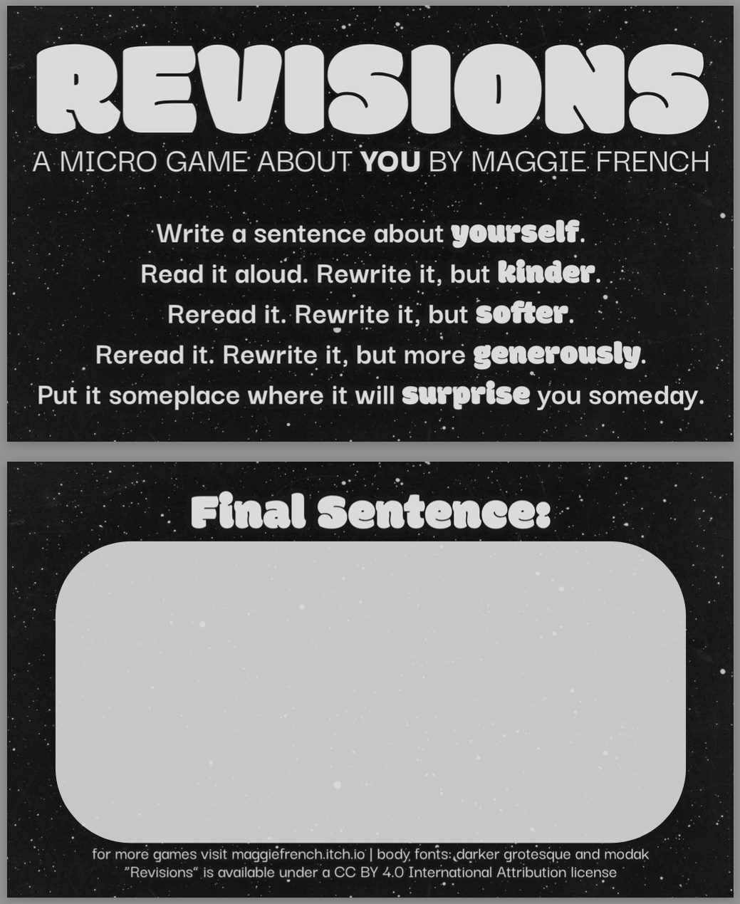 This game was created for the 36-Word RPG Jam. Art is "A Section of the Constellation Cygnus" by Paul Henry, available in the public domain via The Met. Fonts used are Modak by EK Type (header) and Darker Grotesque by Gabriel Lam (body), both available under the SIL Open Font License.